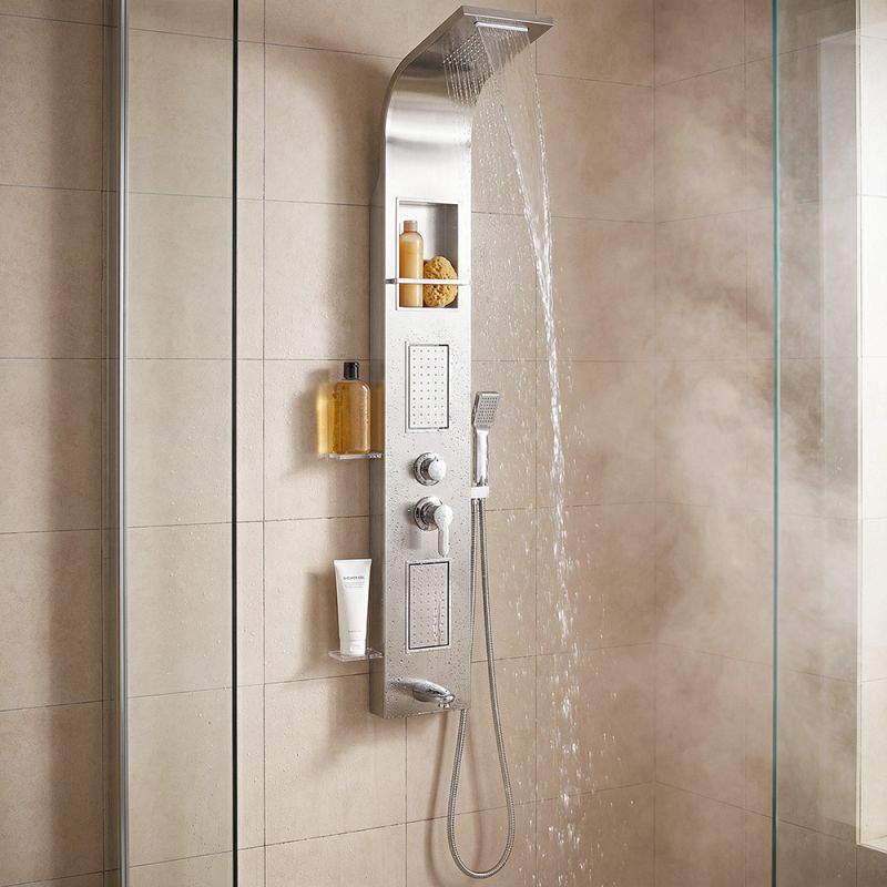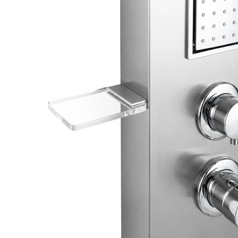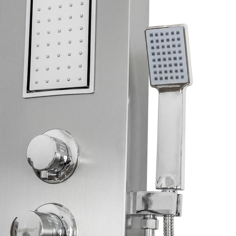 A zuhanypanelen egy felső esőztető is található, amely egyenletes és bőséges vízáramlást biztosít a test teljes körében. Ez a funkció egy kellemes és pihentető élményt nyújt, amely frissítő és feltöltő hatással van a testre és a lélekre. Az esőztető alatt való zuhanyzás luxus érzetet nyújt, és kényezteti az érzékeket. A zuhanypanelen egy kézi zuhanyfej is megtalálható, amely lehetővé teszi a vízsugár irányítását és a célzott tisztítást. Ez a funkció kiválóan alkalmas a test adott részeinek ápolására, valamint a zuhanyzás során történő öblítésre és tisztításra.