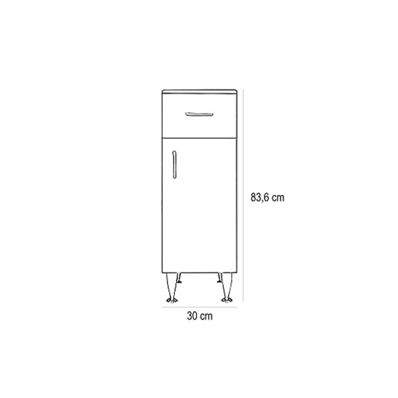A fürdőszobabútor kevés helyet foglal viszont tágas pakolórésszel rendelkezik ahol kényelmesen elférnek a fürdőszobai pipere eszközök. Kevés helyigénye miatt kisebb fürdőszobák berendezésére is alkalmas, például panel lakásokban. A termék magas minőségű bútorlapból készül és színben passzoló élzárókkal van ellátva.