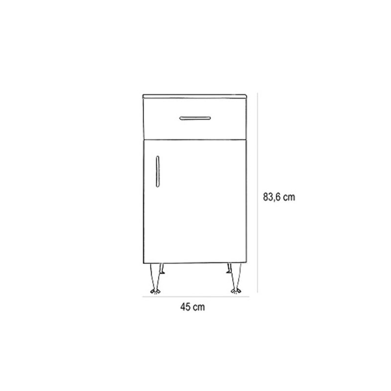 A fürdőszobabútor kevés helyet foglal viszont tágas pakolórésszel rendelkezik ahol kényelmesen elférnek a fürdőszobai pipere eszközök. Kevés helyigénye miatt kisebb fürdőszobák berendezésére is alkalmas, például panel lakásokban. A termék magas minőségű bútorlapból készül és színben passzoló élzárókkal van ellátva.