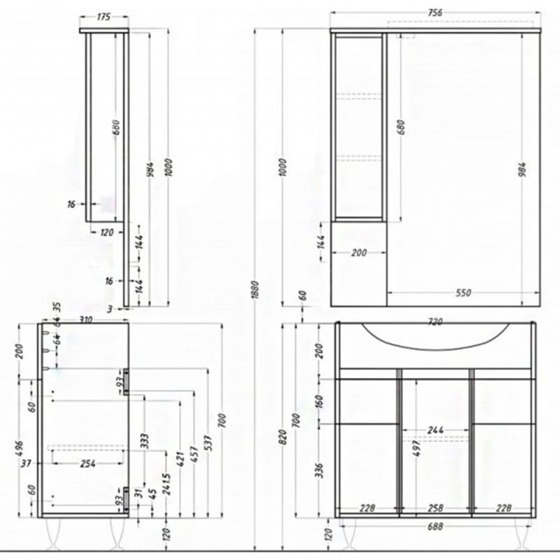 - Felső tükrös elem: 100x75,6x17,5 cm