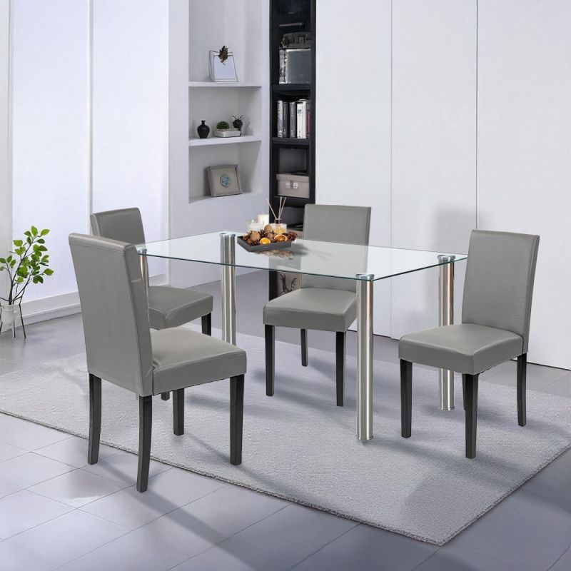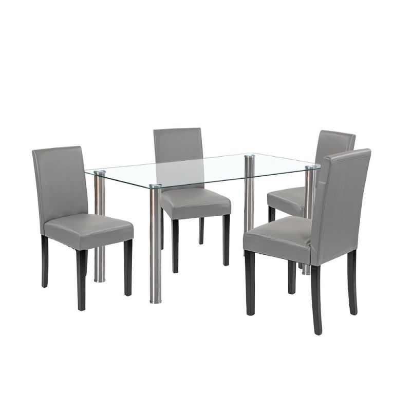 A szett négy darab Leziter Kelly széket is tartalmaz, amelyek szürke ECO bőr kárpitozással készültek. Az elegáns megjelenés mellett ezek a székek rendkívül könnyen tisztíthatók. A 4 cm vastag habszivacs ülőfelület hosszabb étkezések során is komfortot nyújt, a stabil fenyőfa lábak pedig 120 kg teherbírással garantálják a hosszú távú megbízhatóságot.