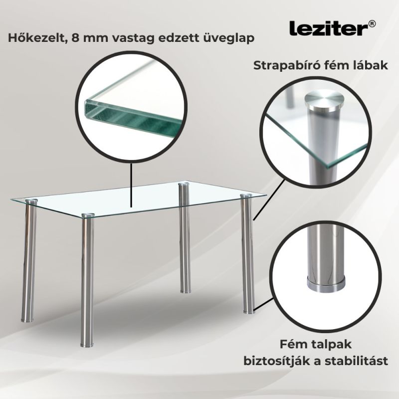 A Leziter Cadiz 4 személyes étkezőgarnitúra minden apró részlete a kényelmet és a praktikusságot szolgálja. A garnitúra része a Leziter Berna étkezőasztal, amely 8 mm vastag edzett üveglappal és rozsdamentes acél lábakkal készült. Az asztallap hőkezelt, karc- és ütésálló, így hosszú távon is megőrzi prémium megjelenését. A 140x80x75 cm-es méret elegendő helyet kínál 4-6 fő számára is, miközben letisztult, minimalista megjelenésével eleganciát sugároz bármilyen környezetben. A lábak alján található műanyag gyűrűk pedig védik a padlót a karcolásoktól és kopástól.