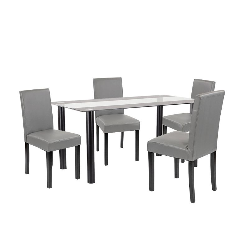 A szett négy darab Leziter Kelly széket is tartalmaz, amelyek szürke ECO bőr kárpitozással készültek. Az elegáns megjelenés mellett ezek a székek rendkívül könnyen tisztíthatók. A 4 cm vastag habszivacs ülőfelület hosszabb étkezések során is komfortot nyújt, a stabil fenyőfa lábak pedig 120 kg teherbírással garantálják a hosszú távú megbízhatóságot.
