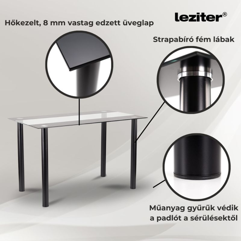 A Leziter Cadiz 4 személyes étkezőgarnitúra minden apró részlete a kényelmet és a praktikusságot szolgálja. A garnitúra része a Leziter Riona étkezőasztal, amely fekete színű, porszórással kezelt acél vázzal és 8 mm vastag edzett üveglappal rendelkezik. Mérete (140x80x75 cm) ideális mindennapi étkezésekhez és kisebb terekhez is, miközben eleganciát sugároz. Masszív, stabil szerkezete 60 kg terhelhetőséget biztosít, a könnyen tisztítható felület pedig foltálló és karcálló, így minden alkalomra tökéletes választás.