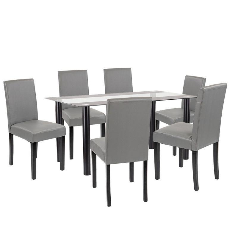 A szett hat darab Leziter Kelly széket is tartalmaz, amelyek szürke ECO bőr kárpitozással készültek. Az elegáns megjelenés mellett ezek a székek rendkívül könnyen tisztíthatók. A 4 cm vastag habszivacs ülőfelület hosszabb étkezések során is komfortot nyújt, a stabil fenyőfa lábak pedig 120 kg teherbírással garantálják a hosszú távú megbízhatóságot.