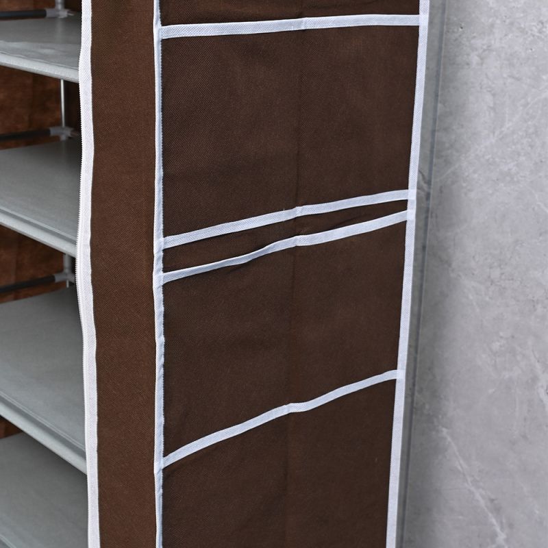 Cipősszekrény LCSZ-02 Barna Az LCSZ-02 barna cipősszekrény egy elegáns és praktikus megoldás a cipők rendszerezett tárolására. Ez a többszintes cipősszekrény nemcsak esztétikus kiegészítője lesz otthonodnak, hanem segít rendben tartani cipőidet és egyéb kiegészítőidet is. Tulajdonságok - Anyag: Tartós fémváz és minőségi, nem szőtt textilborítás, amely ellenáll a mindennapos használatnak, megóvja a cipőket a portól, szennyeződésektől és nedvességtől. A textilanyag légáteresztő, így biztosítja a cipők frissességét és szárazon tartását.