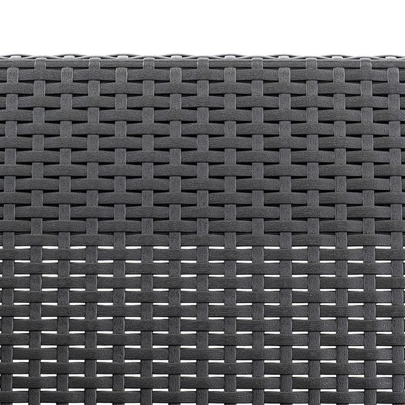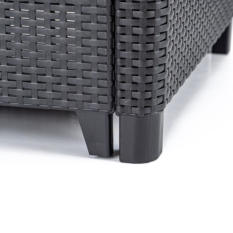 A garnitúra sima karfái, kényelmes háttámlái és a csomagban található puha párnák köszönhetően minden adott a kikapcsolódáshoz. Az elegáns grafit színű rattan hatású anyag nem csupán esztétikus, hanem rendkívül tartós és könnyen tisztítható is.