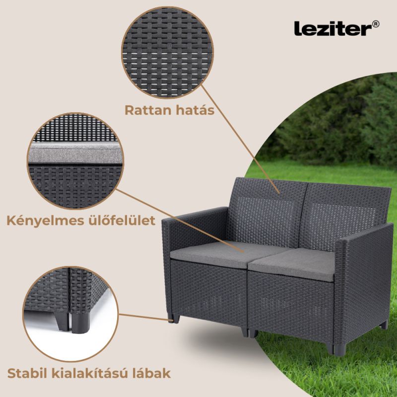 Időtálló bútor: A Grafit színű, stílusos párnákkal rendelkező kerti bútor szett könnyű, egyben tartós vázszerkezettel rendelkezik. Időjárásálló anyagai lehetővé teszik, hogy sok éven át a terasz, vagy az erkély kényelmes darabja maradjon.