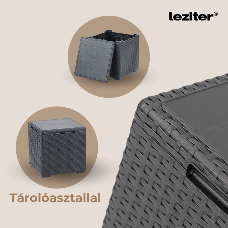 Ez a Grafit színű rattan hatású kerti bútor szett négy fotellel, és egy tárolós asztallal rendelkezik, amelyeket időjárásálló műanyagból készítettek, így nem kell aggódnod a UV sugárzás hatásaitól sem. A fotel magassága: 74 cm, szélessége: 63 cm, hossza: 65 cm. A fotel és a kanapé párnával rendelkezik, mely kényelmessé teszi és színben passzol a bútorhoz. Az asztal magassága: 37 cm, szélessége: 37 cm, hossza: 37. Az asztal több funkciós, így a tároló részében elrejtheted a kerti eszközöket.
