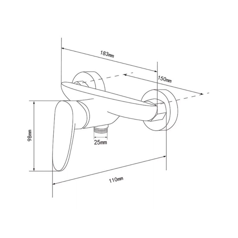 - Méretek: teljes szélesség 183 mm, falitávolság 150 mm, magasság 98 mm, kifolyó hossza 110 mm, kimeneti átmérő 25 mm