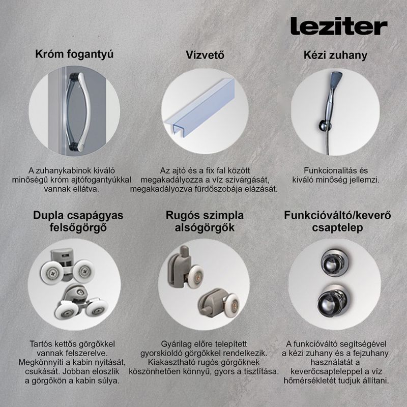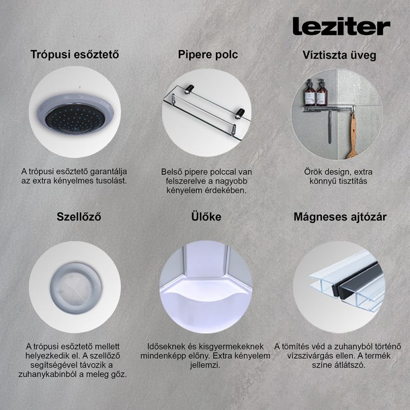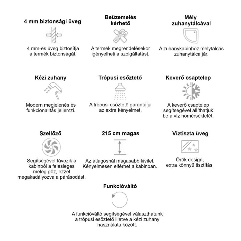 A Cora zuhanykabin számos hasznos funkcióval rendelkezik. Pipere polccal van felszerelve, melynek köszönhetően rendben lehet tartani a tisztálkodáshoz szükséges eszközeit. Trópusi esőztetővel és kézi zuhannyal is rendelkezik, melyet a funkcióváltóval lehet váltakoztatni. A víz hőmérsékletét a keverő csapteleppel lehet beállítani. A trópusi esőztető mellett helyezkedik el kettő szellőző, melyeknek köszönhetően távozik a felesleges meleg gőz ezzel megakadályozva a kabin párásodását.*Biztonsági üveg: A biztonsági üveg egyik nagy előnye, hogy erőhatásra nem történik az üvegben törés. Az edzett üveg ellenáll az őt ért külső erőhatásoknak, melynek köszönhetően igen csak tartós és strapabíró. Magasabb a hőmérsékleti ellenállása. Ezen tulajdonságait egy viszonylag egyszerű hőkezeléssel érik el, amelynek során a méretre vágott üveglapot kb. 650 fokra hevítik, majd hideg levegővel lefújják.