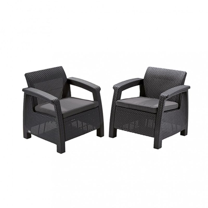 Első pillantásra úgy tünhet, hogy a bútorok rattanból készültek, de valójában egy kiváló minőségű müanyagból hoztak létre, amely ellneáll a szélsőséges időjárási viszonyoknak. Lapos párnák, széles kartámaszok és kontúros háttámlák biztosítják a kényelmet a kerti székek használatakor. A bútorgyártó a Curver márka, amely kiváló minőségű kerti bútorokat készít fröccsöntött műanyagból. Egy csoportban működik a közismert és népszerű Keter és Allibert márkákkal Lengyelországban. A korfu bútorokat a vállalat magyar gyárában gyártják. Az egységes szín és a formatervezés a Corfu sorozaton belül lehetővé teszi a Corfu Duo fotelok használatát a sorozat többi készletének kiegészítéseként.