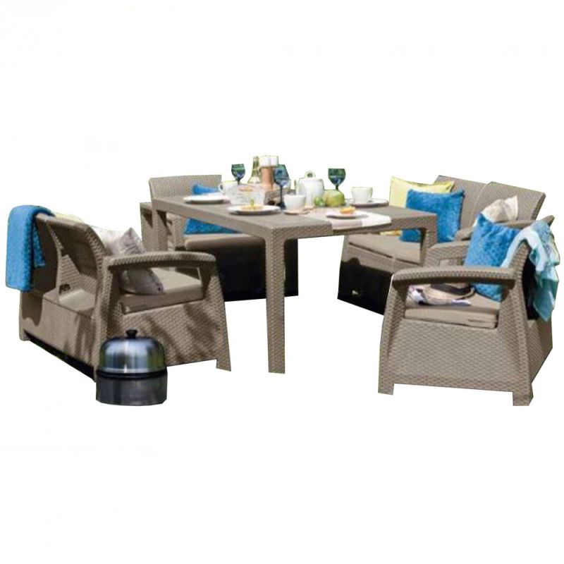 A Corfu Fiesta kerti bútorai nagyon tartós műanyagból, polipropilénből készülnek. Nagy ellenállást biztosítanak a víz és az UV sugárzás ellen. További előnye még, hogy könnyű és tartós. A párnahuzatoknak megnövelt vízállósága is van, csak nagyobb esőzések esetén el kell rejteni.