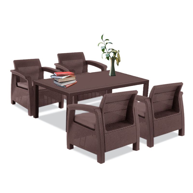 A stílusos Corfu duo szabadidő bútor szett maximális kényelmet garantál a felhasználók számára. A szettet modern dizájn jellemez, melyet természetes rattan fonás inspirált. A szett stabilitását és kényelmét szolid felépítésének és átgondolt szerkezetének köszönheti. A bútor szett négy egyszemélyes fotelt és egy asztalt tartalmaz. A Corfu termékvonal - kényelmes párnákkal kapható. A bútorok ellenállnak az időjárás viszontagságainak és az UV sugárzásnak.A bútorokat a Curver gyártja, kiknek termékei megtalálhatóak még Keter márkanév alatt is. A Corfu egy kiváló minőségű európai termék, amely a legjobb minőségű fröccsöntött műanyagból készült.
