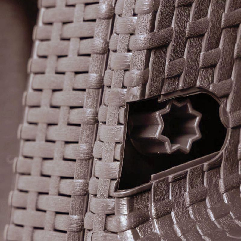 A bemutatott készlet megvalósítása - polyrattan utánzása. A bútorok anyaga tökéletesen utánozza a polirattant - valójában nehéz megkülönböztetni a valódi fonattól. A polipropilén mellett a gyárilag préselt polipropilén időjárásálló. Az erős napsütésben is védett a fakulás ellen, köszönhetően annak, hogy a polipropilén ellenáll az UV sugárzásnak . Ebből az anyagból készült bútorokat szintén nagyon könnyű tisztán tartani. Kis mennyiségű mosószer vagy akár nedves ruha is elegendő a makacs foltok megszabadításához.