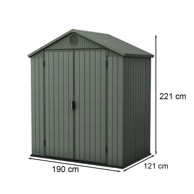 Méretei: 190 x 121 x 221 cm, ami ideális teret biztosít a kerti szerszámok, kerti bútorok, vagy akár a kerékpárok tárolására. Ezek a méretek tökéletesen illeszkednek a legtöbb kertbe, anélkül, hogy túl nagy helyet foglalnának.