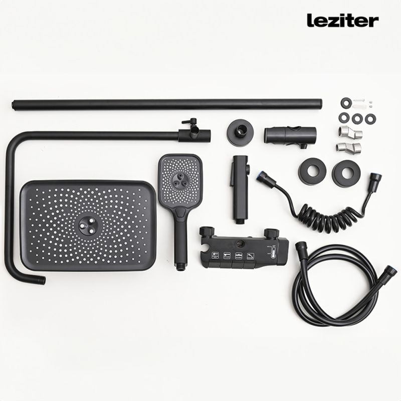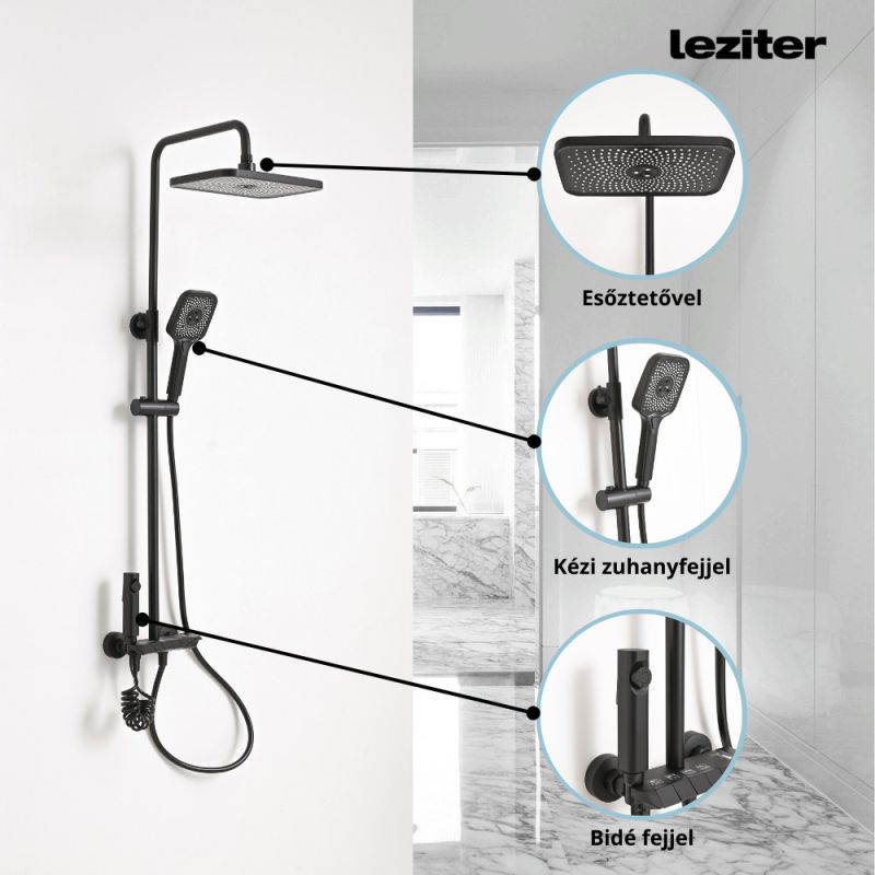 Luxuskategóriás zuhanyélmény minden napAz Eliz multifunkciós zuhanyszett a Leziter prémium kategóriájú modellje, amely a design, a funkcionalitás és a kényelem tökéletes egyensúlyát kínálja. A modern fekete árnyalat és a letisztult formák elegáns megjelenést kölcsönöznek bármilyen fürdőszobának, miközben a sokoldalú funkciók gondoskodnak a személyre szabott zuhanyélményről. Tartós, megbízható anyaghasználatA zuhanyszett minden eleme hosszú távra készült: - Tömör sárgaréz csaptelep: kiváló korrózióállóság és masszív szerkezet a hosszú élettartam érdekében.