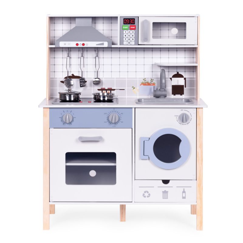 NAGYSZERŰ SZÓRAKOZÁS Fedezd fel a főzés örömét az ECOTOYS nagy, fából készült konyhájával. Ez nem csak egy játék – ez egy módja a kreativitás, a kézügyesség és a körülötted lévő világról való tudás fejlesztésének. Tökéletes szerepjátékhoz, megtanítja a gyerekeknek a főzés alapjait és az ételek elkészítését biztonságos és inspiráló módon. Tökéletes mind az **egyedüli, mind a barátokkal való játékhoz**, aminek köszönhetően támogatja a **szociális készségek fejlődését**. Masszív felépítésének és gyönyörű, színes kidolgozásának köszönhetően a konyha **remekül mutat gyerekszobákban vagy játszószobákban**. MINT EGY IGAZI KONYHÁBAN A konyha **realisztikus kinézetű konyhai felszerelésekkel** van felszerelve, aminek köszönhetően **még lebilincselőbb lesz a móka. - Egy kis szakácsnak mindig ügyelnie kell arra, hogy az ételei melegek és ízletesek legyenek, ezért bármikor melegítheti azokat egy játék mikrohullámú sütőben, amely működési hangokat ad ki jellegzetes "csilingeléssel", amikor az étel melegszik.