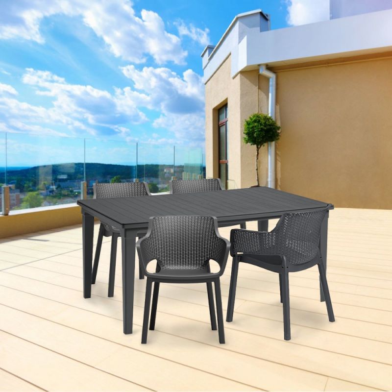 A asztal körül kényelmesen elfér 4, de akár 6 fő is .A tökéletes méret szinte minden kertbe vagy erkélyre alkalmas. A Resolith kivitel a fényűző fa megjelenését és érzetét szolgálja.Az időjárásálló konstrukció nem rozsdásodik ezért szuper könnyű karbantartani.Étkezzen az árnyékban napos időben esernyővel. UV-védelem alatt álló asztal megőrzi élénk színét még erősebb napfény esetén is.