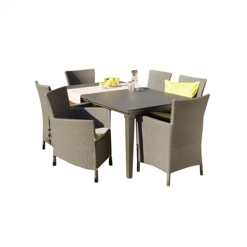 Az egyszerű és elegáns formájú Futura szett ideálisan betölt minden ház körüli teret. Az asztalnál kényelmesen elfér 4 személy. Könnyű összeszerelni; ellenáll a kedvezőtlen időjárási feltételeknek. Tisztítás mosószeres vízben áztatott ruhadarabbal. Csomag tartalma: 6 x szék, 1 x asztal.