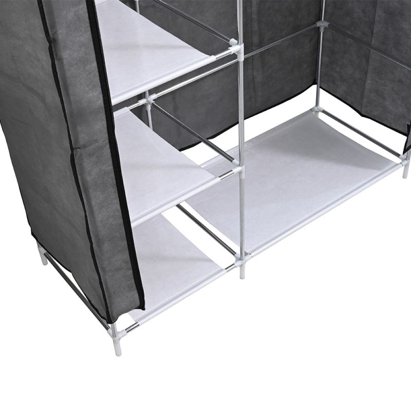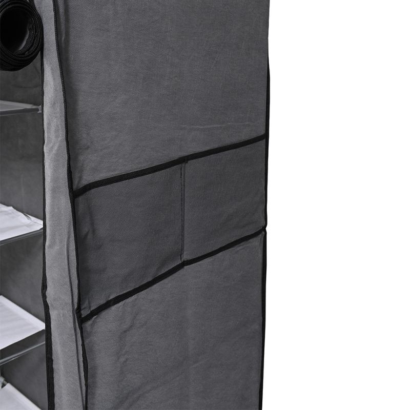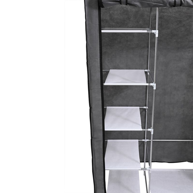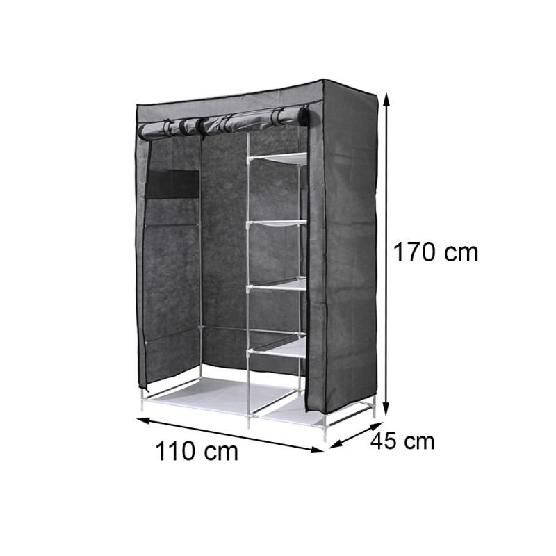 Gardróbszekrény LGSZ-01 SzürkeAz LGSZ-01 szürke gardróbszekrény ideális választás mindazok számára, akik praktikus és esztétikus tárolási megoldást keresnek otthonukba. Ez a könnyen összeállítható szekrény tökéletes ruhák, cipők és egyéb kiegészítők rendszerezett tárolására, miközben modern és elegáns megjelenésével bármelyik helyiségben jól mutat. Tulajdonságok- Anyag: Tartós fémváz és magas minőségű poliészter szövetborítás, amely ellenáll a mindennapos használatnak, és megóvja a ruhákat a portól és szennyeződéstől. A fém szerkezetet műanyag rögzítőelemek erősítik meg, biztosítva a szekrény stabilitását.