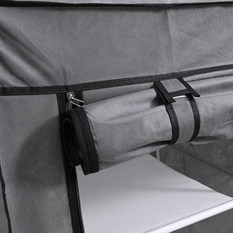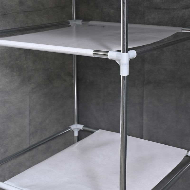 - Stabilitás: A masszív fémváz és ellenálló vascsövek biztosítják a stabil és megbízható használatot, még teljes terhelés mellett is. A szekrény huzata poliészterből készült, amely lehetővé teszi a levegő keringését, így frissen tartja a ruhákat.
