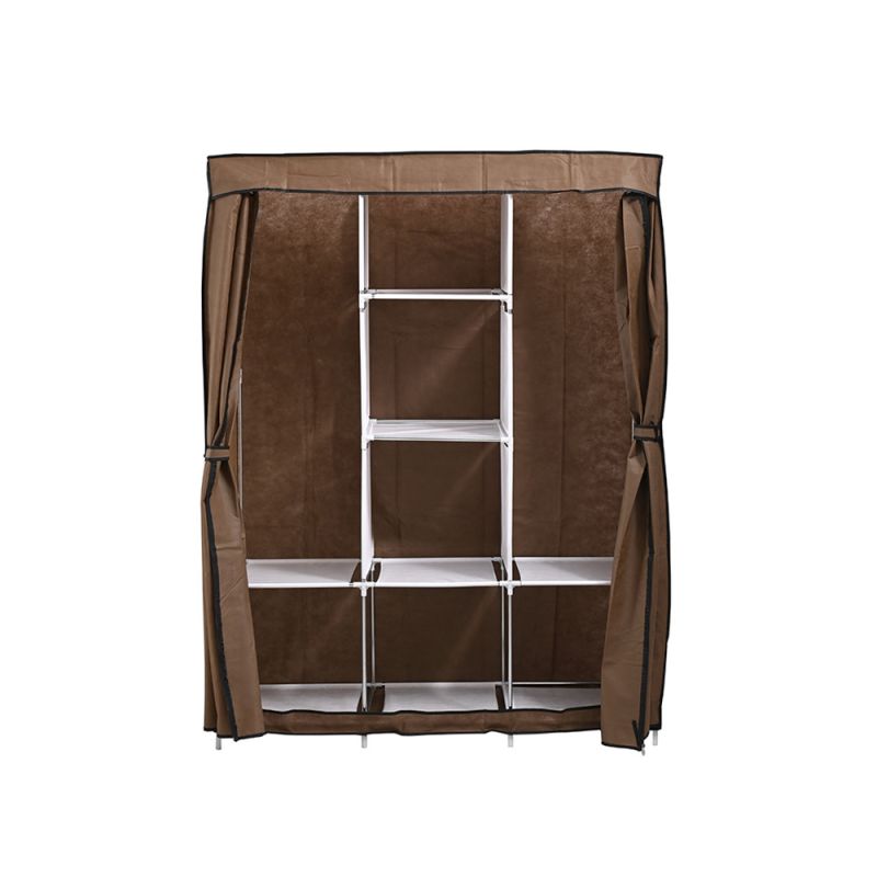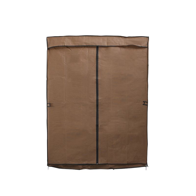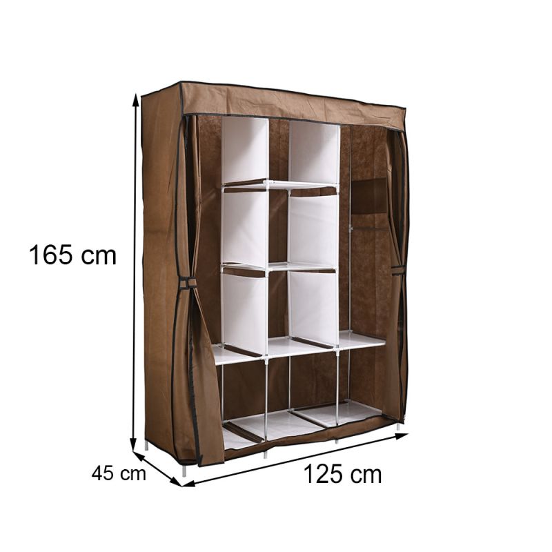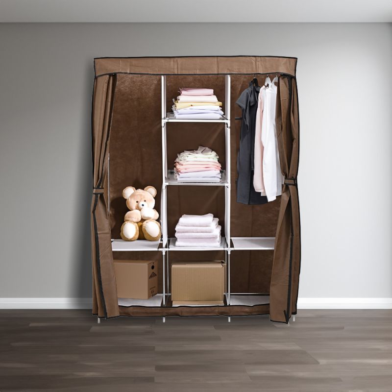 Gardróbszekrény LGSZ-03 Coffee Az LGSZ-03 kávé színű gardróbszekrény egy praktikus és elegáns tárolási megoldás mindazok számára, akik rendszerezett és esztétikus módon szeretnék tárolni ruháikat és kiegészítőiket. Ez a könnyen összeállítható szekrény tökéletes választás bármelyik helyiségbe, modern és letisztult megjelenésével pedig minden belső térhez jól illeszkedik. Tulajdonságok - Anyag: Tartós fémváz és magas minőségű szövetborítás, amely megóvja a ruhákat a portól. A színes védőhuzat feldobja a környezetet, és a cipzáras ajtó biztonságos használatot garantál.