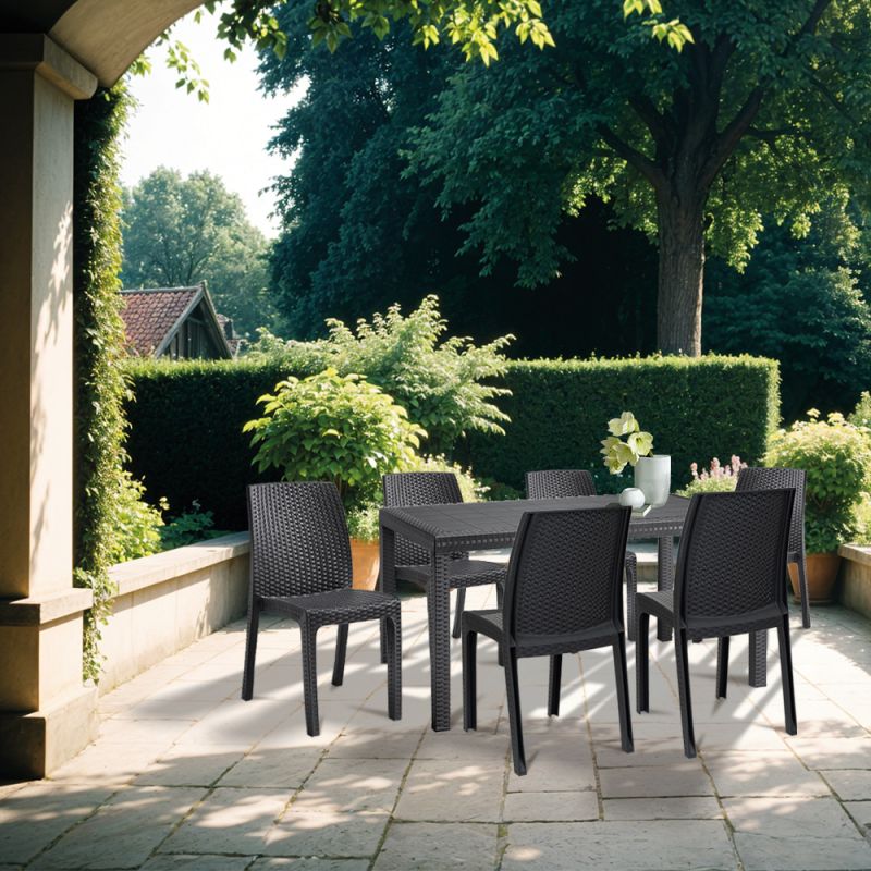 Olaszországban készült ez a grafit színű, kényelmes és elegáns bútor szett. Hat 47x 59x 86 cm-es széket és egy 150x 90x 74 cm-es négyszögletes magas asztalt foglal magába. Méretén és kényelmén kívül kedvező lehet, hogy összeszerelése nem igényel szakmai tudást és könnyen mozgatható, így mindig oda teheted ahol éppen szükséged van rá.