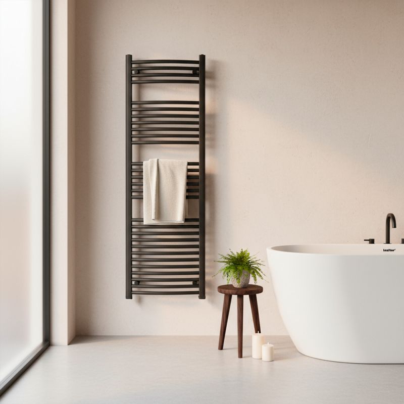Íves törölközőszárító radiátor 1400x500 mm fekete – modern elegancia, erőteljes hőleadás, prémium kivitel