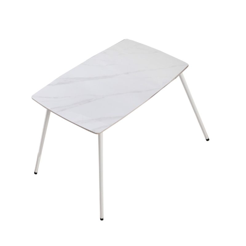 Az asztal fehérre festett, masszív fém lábai stabil tartást adnak, a műanyag végződések pedig védik a padlót a karcolásoktól – akár fa-, akár csempeburkolatról van szó. Kompakt, de kényelmes méretével (140×80 cm) akár 4–6 fő kényelmesen elfér körülötte.