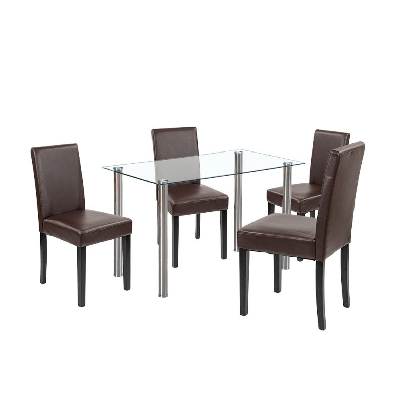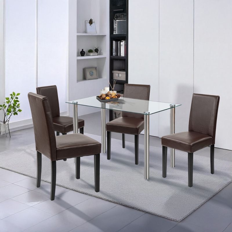 A szett négy darab Leziter Kelly széket is tartalmaz, amelyek barna ECO bőr kárpitozással készültek. Az elegáns megjelenés mellett ezek a székek rendkívül könnyen tisztíthatók. A 4 cm vastag habszivacs ülőfelület hosszabb étkezések során is komfortot nyújt, a stabil fenyőfa lábak pedig 120 kg teherbírással garantálják a hosszú távú megbízhatóságot.
