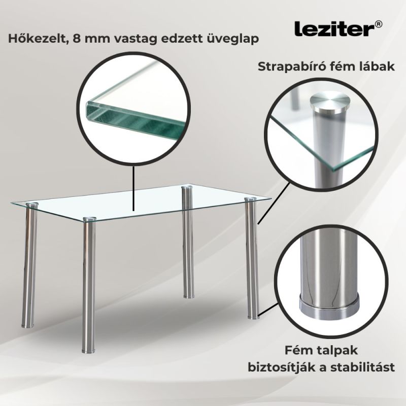 A Leziter Karin 4 személyes étkezőgarnitúra minden apró részlete a kényelmet és a praktikusságot szolgálja. A garnitúra része a Leziter Berna étkezőasztal, amely 8 mm vastag edzett üveglappal és rozsdamentes acél lábakkal készült. Az asztallap hőkezelt, karc- és ütésálló, így hosszú távon is megőrzi prémium megjelenését. A 120x70x75 cm-es méret elegendő helyet kínál 4-6 fő számára is, miközben letisztult, minimalista megjelenésével eleganciát sugároz bármilyen környezetben. A lábak alján található műanyag gyűrűk pedig védik a padlót a karcolásoktól és kopástól.