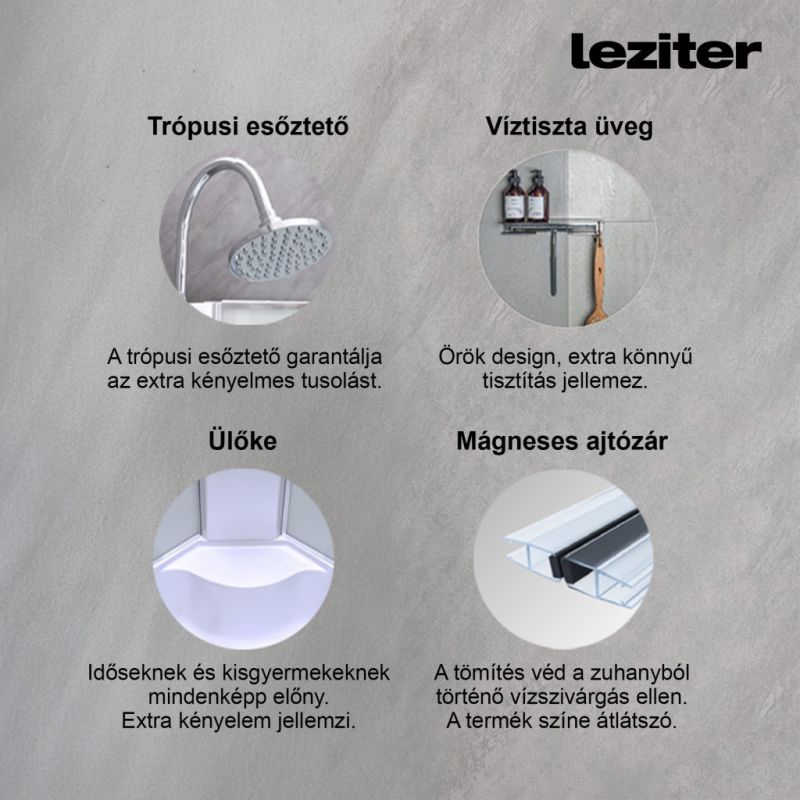 - Felszereltség: Trópusi esőztető, kézi zuhany, keverő csaptelep, funkcióváltó, mágneses ajtózár, beépített ülőke