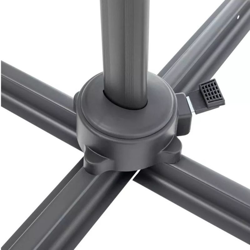 A kerti napernyő stabilitását jelentősen befolyásolja a kereszt talp. Az Ön kényelme érdekében egy rögzített fogantyú segítségével könnyen összecsukható. A napernyő előnye az alapban lévő forgó mechanizmus és a dőlésszög beállítás kombinációja. Ez lehetővé teszi az ernyő tetszőleges pozícionálását és az árnyékoló hely kiválasztását a napfény beesési szögének megfelelően.
