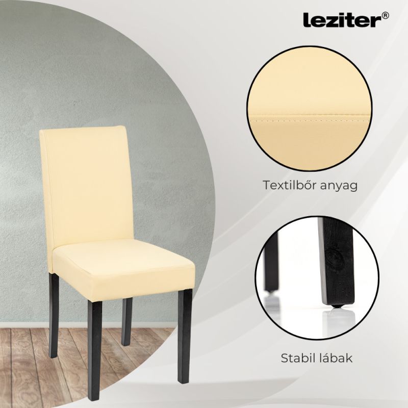 A garnitúra része négy darab Leziter Kelly szék, amelyek bézs ECO bőr kárpitozásuknak köszönhetően nemcsak elegánsak, hanem rendkívül könnyen tisztíthatók is. A vastag, 4 cm-es habszivacs ülőfelület kényelmet biztosít akár egy hosszabb vacsora során is, a stabil fenyőfa lábak pedig 120 kg-os teherbírásukkal még intenzív használat esetén is megbízható társak maradnak.