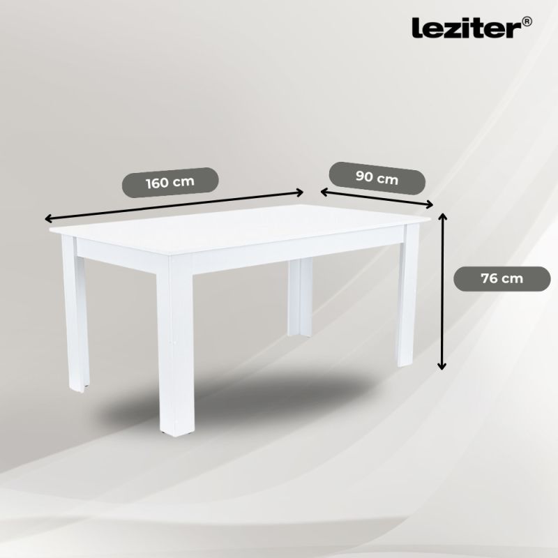 A Leziter Yorki étkezőasztal fehér színével és letisztult formavilágával friss, modern hangulatot teremt a helyiségben. Praktikus mérete (160x80x76 cm) miatt kényelmesen elfér közepes és nagyobb étkezőkben is, ahol a tágas kialakítás elegendő helyet biztosít négy fő számára, de szükség esetén akár hatan is kényelmesen elférnek körülötte. A vastag, strapabíró bútorlap időtálló és karcálló, a fém sarokmegerősítések pedig gondoskodnak az extra stabilitásról. A lapra szerelt kivitelnek köszönhetően az összeszerelése gyors és egyszerű, így hamar élvezheted az új étkeződ kényelmét és eleganciáját.