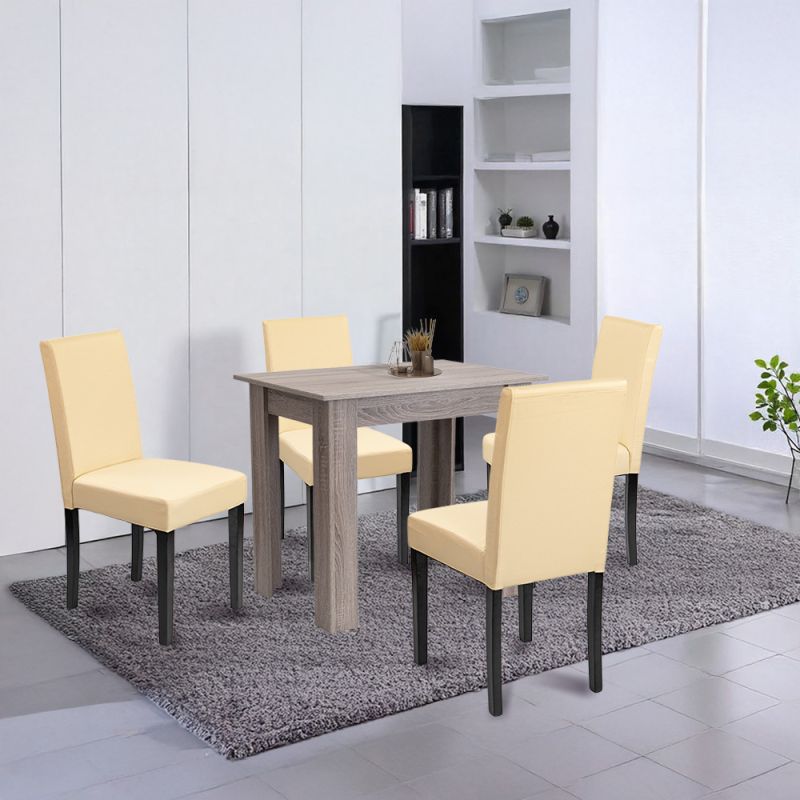 A garnitúra része négy darab Leziter Kelly szék, amelyek bézs ECO bőr kárpitozásuknak köszönhetően nemcsak elegánsak, hanem rendkívül könnyen tisztíthatók is. A vastag, 4 cm-es habszivacs ülőfelület kényelmet biztosít akár egy hosszabb vacsora során is, a stabil fenyőfa lábak pedig 120 kg-os teherbírásukkal még intenzív használat esetén is megbízható társak maradnak.