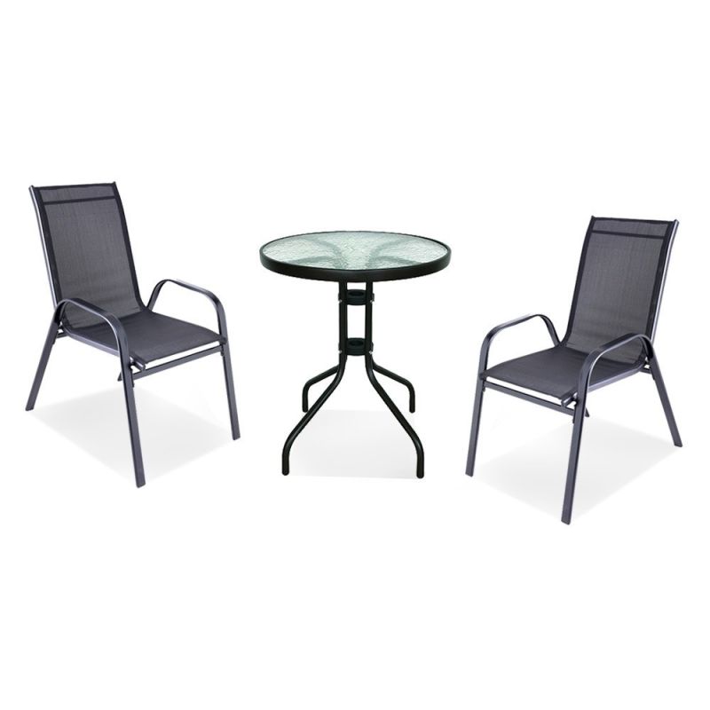 A modern kivitelű kerti bútorkészlet egy kerti üveglapos asztalt és 2 karfás széket tartalmaz, melyek teherbírása 120 kg. A bútorokat 2 fő számára tervezték. A székek és az asztal lábazata fémből készül. Az asztallap 5 mm-es edzett üvegből készült, amely ellenáll a kisebb karcolásoknak. Az textilén szék ülésanyaga ellenáll az időjárási viszonyoknak. Előnye az ergonómikusan profilált ülés és karfa, amelyek tehermentesítik a vállakat pihenés közben.