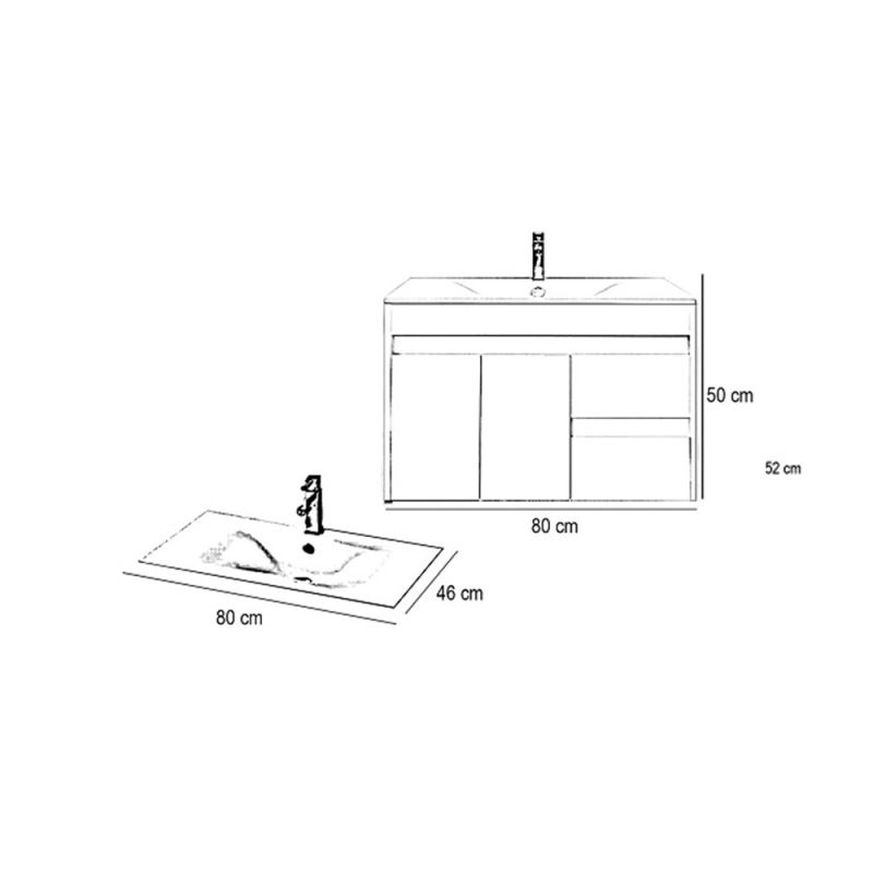 A fürdőszoba bútor tágas fiókokkal rendelkezik ahol kényelmesen elférnek a fürdőszobai pipere eszközök. Kompakt kialakítása miatt kisebb fürdőszobák berendezésére is alkalmas, például panel lakásokban. A termék magas minőségű bútorlapból készül és színben passzoló élzárókkal van ellátva. A fürdőszoba bútor felfüggesztett kivitelben kapható.A terméket összeszerelve szállítjuk így nem kell aggódnia az összerakás miatt sem.