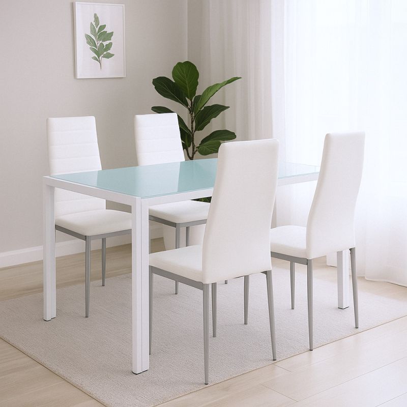 A Mabel 4+1 étkezőgarnitúra ideális választás, ha egyesítenéd a stílust, a kényelmet és a praktikumot. A letisztult vonalvezetésű asztal edzett, hőkezelt, ütésálló üveglappal és fehér, porfestett fém lábakkal készült – ez a kombináció egyszerre világosítja a teret és biztosít stabilitást a mindennapok során. Az asztal 140 × 80 cm-es méretének köszönhetően ideálisan elfér kisebb konyhákban és étkezőkben is, miközben akár 4–6 fő számára is kényelmes étkezést biztosít.
