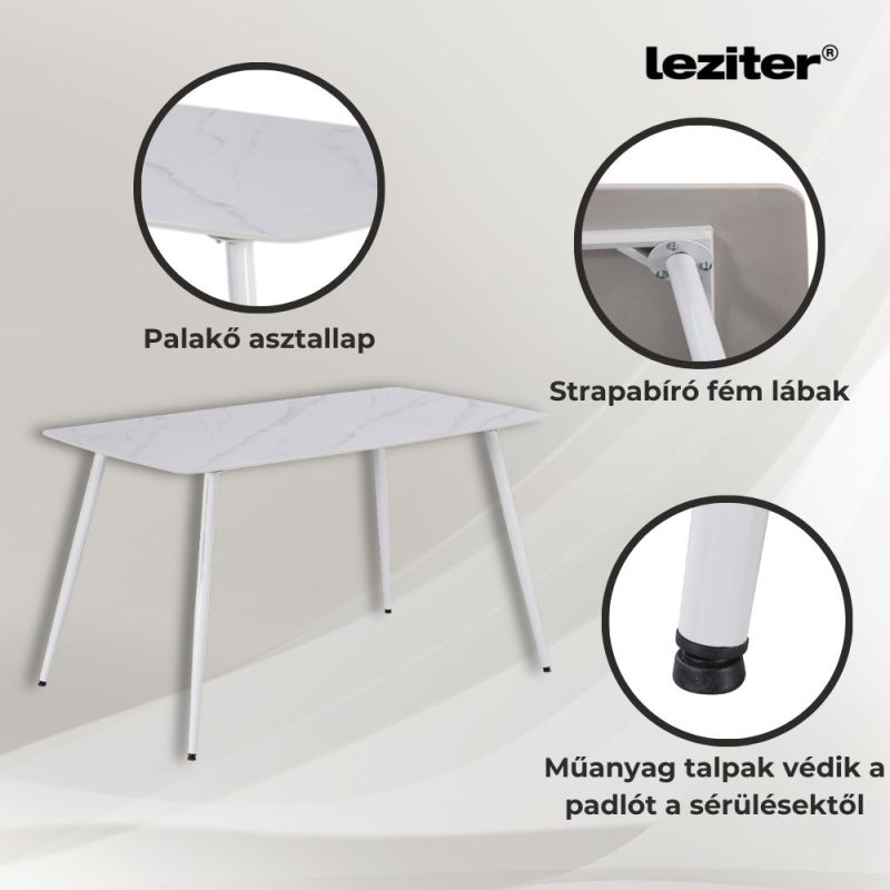 A Leziter Bora étkezőasztal fehér színével és letisztult, modern formavilágával kifinomult hangulatot teremt a helyiségben. Mérete (140x80x75 cm) miatt ideális közepes és nagyobb terekbe is, kényelmes helyet biztosítva akár 4-6 fő számára. Az asztallap szinterezett kőből készült, amely természetes textúrájának és prémium gyártási technológiájának köszönhetően rendkívül karc-, folt- és hőálló. A fehérre festett fém lábak gondoskodnak az extra stabilitásról, míg a műanyag talpak védelmet nyújtanak a padlónak. A lapra szerelt kivitel gyors és egyszerű összeszerelést tesz lehetővé, így hamar élvezheted új étkeződ eleganciáját és kényelmét.