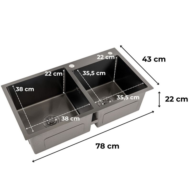 A különleges, karc- és foltálló fekete bevonat nemcsak stílusos megjelenést ad, de ellenáll a mindennapi használat során keletkező karcolásoknak és szennyeződéseknek is. Vízlepergető tulajdonságának köszönhetően a tisztítás gyors és egyszerű, így a mosogató hosszú távon is megőrzi kifogástalan állapotát. A mély tálcák kényelmes használatot biztosítanak, a zajcsökkentő bevonat pedig nyugodt, csendes mosogatási élményt kínál.