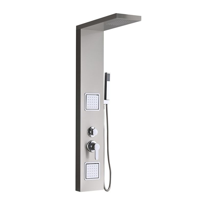 A zuhanypanel sárgaréz csapteleppel és cink fogantyúval van felszerelve, amelyek kiváló minőségű anyagokból készültek, biztosítva a hosszú élettartamot és a megbízható működést. A sárgaréz csaptelep lehetővé teszi a könnyű és pontos vízszabályozást, és a cink fogantyúval való könnyű kezelhetőség tovább fokozza a zuhany élményét. A zuhanypanel felső részén egy 45 cm-es esőztető található, amely pazar zuhanyszerű érzést kelt, mintha az eső frissítő cseppei zuhannának a testre. Az esőztető széles átmérője lehetővé teszi, hogy a víz széles körben eloszoljon, így tökéletes ellazulást biztosít a fürdés során.
