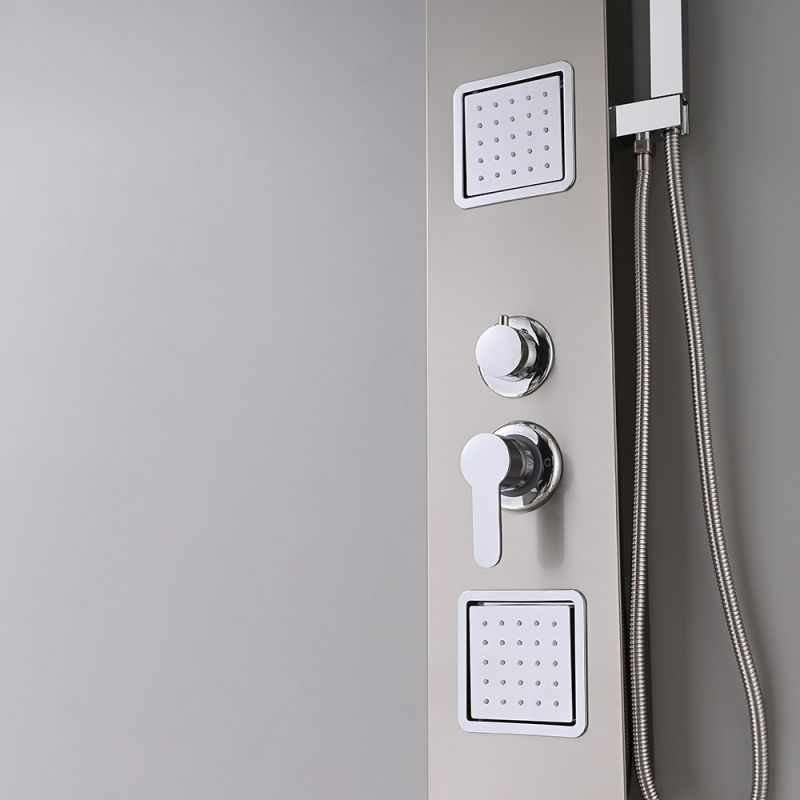 A Merino hidromasszázs zuhanypanel egy kiváló minőségű, modern és stílusos zuhanypanelegyüttes, amelyet az élménydús fürdőzés és zuhanyozás szerelmeseinek terveztek. A panel mérete 119x19x6,5 cm, ami ideális méretet biztosít a fürdőszobák számára, akár a nagyobb, akár a kisebb terekhez. Ez a zuhanypanel 0,8 mm vastagságú szálcsiszolt rozsdamentes acélból készült, ami nemcsak kiemelkedően tartós, de elegáns megjelenést is kölcsönöz a fürdőszobának. A szálcsiszolt felület finom és esztétikus, tovább fokozva a zuhanypanel vonzó megjelenését. A rozsdamentes acél anyagból készült zuhanypanel ellenáll a rozsda, a vízkő és a korroziónak, így hosszú élettartammal rendelkezik, és könnyen tisztán tartható.