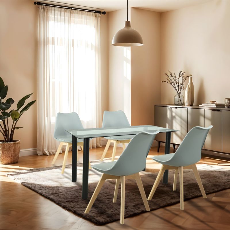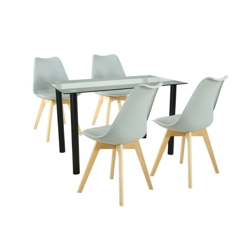 | Design | fekete színű, porszórással kezelt acél váz, edzett üveg asztallap | szürke színű prémium polipropilén, bükkfa színű tartós faanyag | | Anyag | Edzett üveg asztallap, acél váz | szürke PP ülőfelület, szürke PVC párnázat, bükkfa színű lábak | | Méretek | 120 cm x 70 cm x 75 cm | Magasság: 81 cm, Szélesség: 49 cm, Ülésmélység: 43 cm, Ülőmagasság: 45 cm | | Szín | szürke | szürke | | Tartósság | 8 mm vastag edzett üveg, tartós acél váz | Tartós anyagok, kényelmes PVC párnázat | | Kényelem | Könnyen tisztítható üvegasztallap | Extra kényelmet nyújtó PVC párnázat | | Tisztíthatóság | Egyszerűen tisztán tartható | Könnyű tisztíthatóság | | Illeszkedés | Időtlen szürke szín, harmonizál bármilyen enteriőrrel | Időtlen szürke színvilág, könnyen illeszkedik bármilyen belsőtérbe |