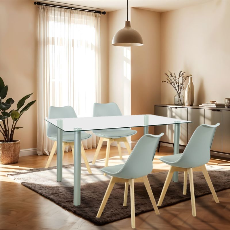 Az asztal üveg vastagsága: 8 mm edzett üveg. Terhelhetősége 60 kg. Szék terhelhetősége 120 kg. Silla étkezőszék- Elegáns design: szürke színű, polipropilén ülőfelület és szürke PVC párnázat, természetes bükkfa színű lábakkal. Modern és elegáns megjelenés.
