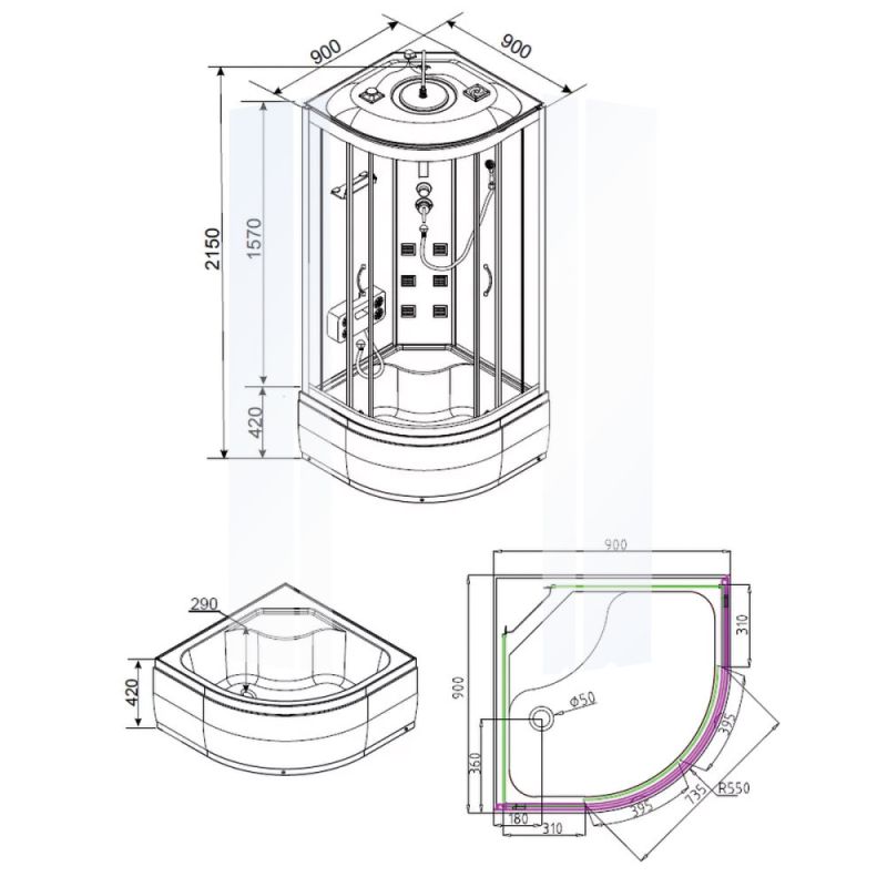 - Típus: Íves hidromasszázs zuhanykabin