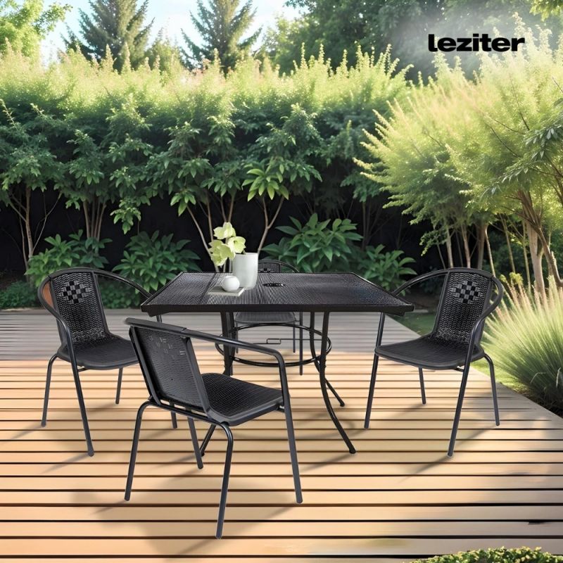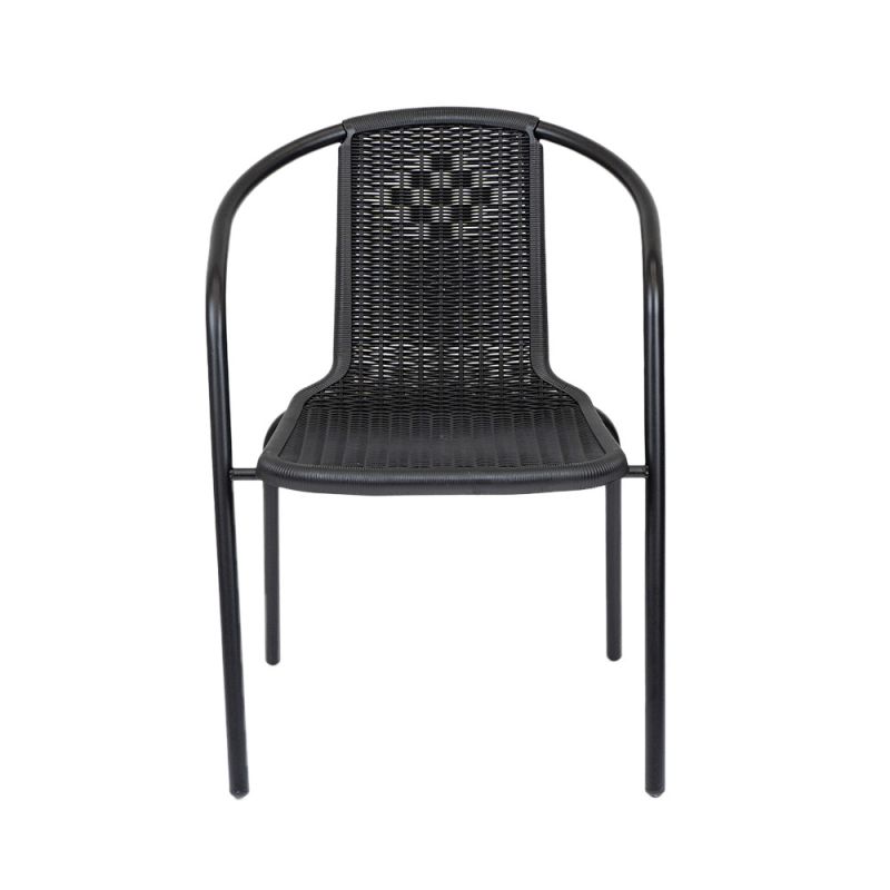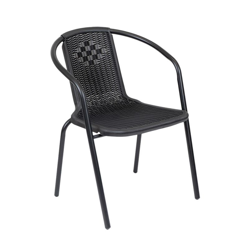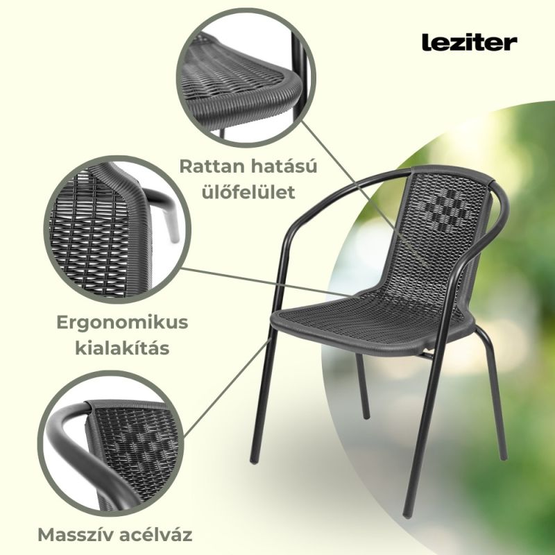 Ez egy egyszerű és nagyszerű modern kerti szék, ami rattan hatású fonott ülőfelülettel rendelkezik. Kiválóan alkalmas étkezéshez és a szabadban történő pihenéshez is. Akár lakossági, de üzleti használatra is tökéletes, például éttermek, bisztrók, szórakozóhelyek számára. Nagyon praktikus, mert egymásra helyezhető, azaz rakatolható, így a tárolása egyszerű, nem foglal sok helyet. Acélvázának köszönhetően stabil és masszív kivitel, időtálló megoldás, műanyag felületének köszönhetően könnyen tisztántartható.