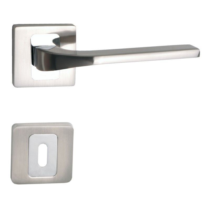 A króm-szatén-nikkel négyzetrozettás BB záras kilincs kilincs, letisztult formavilága a modern otthonok és helyiségek tökéletes kiegészítője. Normálkulcsos beltéri ajtó kilincs.