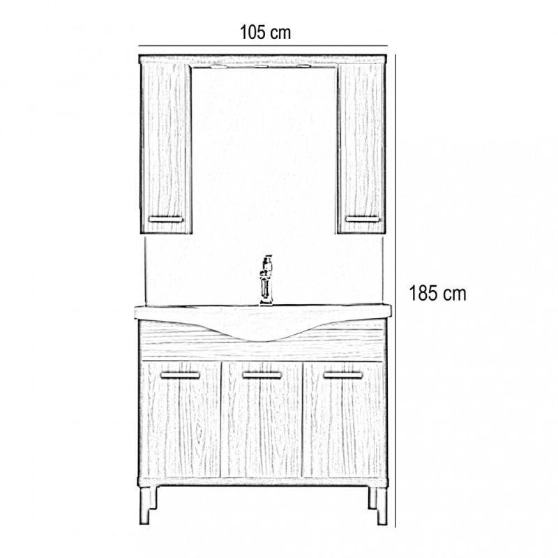 A fürdőszobabútor kevés helyet foglal viszont tágas alsó és felső szekrénnyel rendelkezik, ahol kényelmesen elférnek a fürdőszobai pipere eszközök. Kevés helyigénye miatt kisebb fürdőszobák berendezésére is alkalmas, például panel lakásokban. A termék magas minőségű bútorlapból készül és színben passzoló élzárókkal van ellátva. A fürdőszobabútor mosdóval együtt kapható.